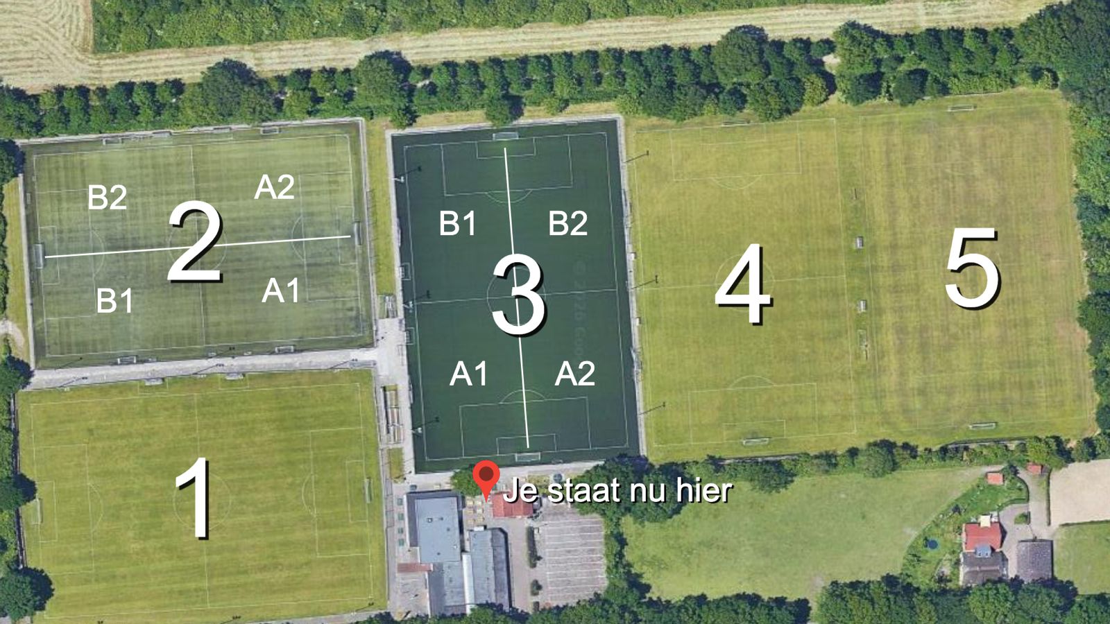 Hier is een overzicht van onze velden en van de indeling van de velden bij halve velden en kwartvelden.
