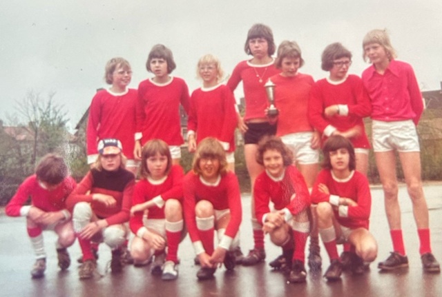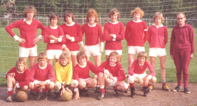 Marco Keller, voor vierde van links, met het team van de Apolloschool, de eerste schoolvoetbalkampioen in de Hoevelakense geschiedenis. April 1975.