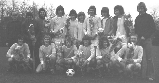 Sigmund Beitler, gehurkt tweede van rechts, met de kampioensbloemen in het succesrijke seizoen 1974-1975 met Hoevelaken A1.