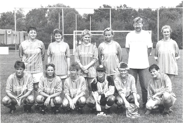 Annelies Polhuis, staand derde van links, Jeannette van de Grift, voor derde van links, en Henny Nieuwenburg, voor geheel rechts, in augustus 1990, bij de start van het seizoen 1990-1991.