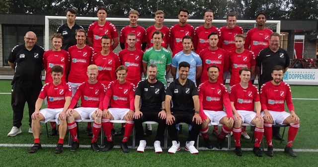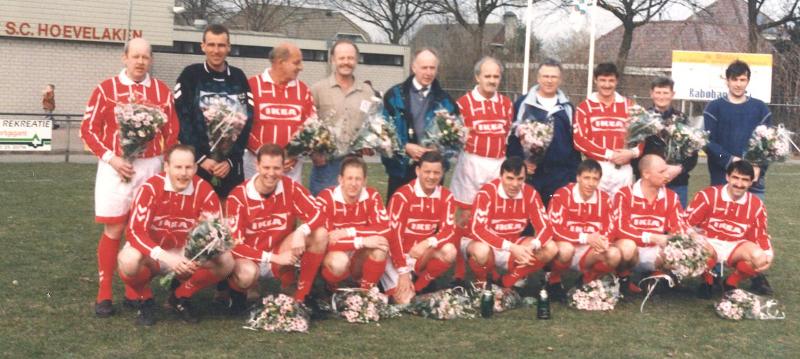 Henk Vonder, gehurkt linksvoor, met de kampioensbloemen van Hoevelaken 7 in maart 1996.