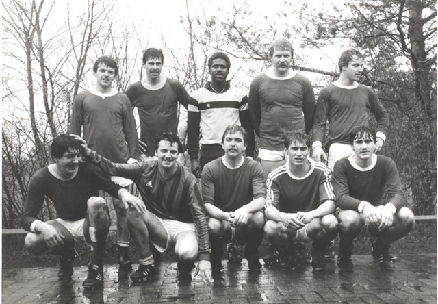 Martien van de Pol, staand tweede van links, met Hoevelaken 5 in het seizoen 1984 - 1985.